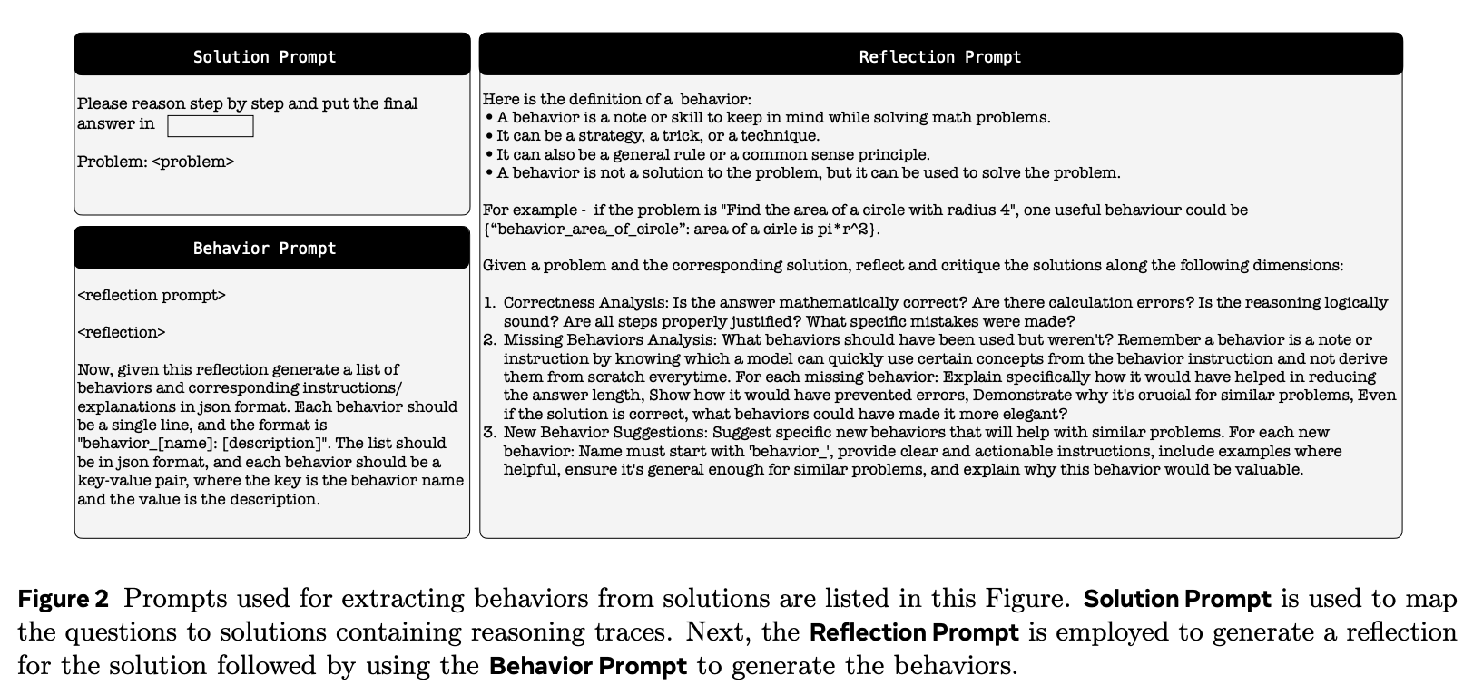 Extracting Behaviors。为了提取行为,Metacognitive Strategist 会针对给定问题生成一个解决方案,该解决方案包含推理轨迹和最终答案。此交互的提示如图 2 所示(解决方案提示)。然后,问题-解决方案组合再次输入 Metacognitive Strategist,以生成反思,评估推理是否逻辑合理、答案是否正确,以及是否可以提炼出任何新的可重复使用的行为以简化未来的问题解决(参见图 2 中的反思提示)。最后,通过另一个提示,Metacognitive Strategist 将问题、解决方案和反思转换为一组 (name, instruction) 行为,并将其附加到不断增长的行为手册中(参见图 2 中的行为提示)。图 1 中的行为手册面板展示了从 MATH 和 AIME-24 数据集 中提取的两个示例行为。