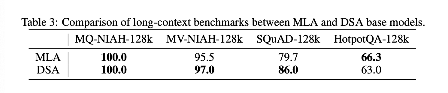 DSA 训练从中期训练结束时的基础模型开始。预热阶段包含 1000 个步骤,每个步骤使用 14 个序列(每个序列包含 202,752 个 token)进行训练,最大学习率为 5e-3。稀疏自适应阶段使用中期训练的训练数据和超参数,并处理 200 亿个 token。虽然训练预算远小于 DeepSeek-V3.2(9437 亿个 token),但我们发现这足以使 DSA 模型自适应到与原始 MLA 模型性能相当的水平。如表 3 所示,DSA 模型的长上下文性能与 MLA 模型接近。为了进一步验证 DSA 训练的有效性,我们分别使用相同的 SFT 数据集对 DSA 和 MLA 模型进行微调,发现两个模型在训练损失和评估基准方面表现一致。