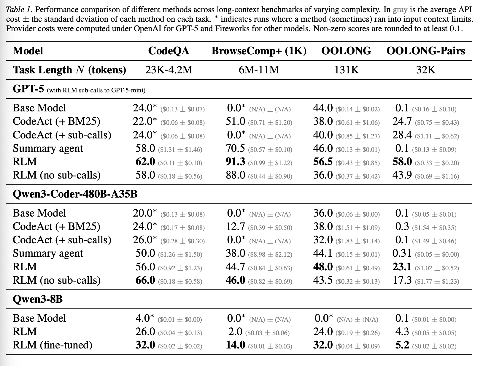 我们使用两种现代语言模型(GPT-5,中等推理能力和默认采样参数)以及 Qwen3-Coder-480B-A35B(采样参数采用 Qwen Team (2025b) 中描述的方法)将 RLM 与常用的任务无关推理方法进行比较。对于 Qwen3-Coder-480B-A35B,我们基于计算提供商 Fireworks 计算成本。除了评估基础模型在所有任务上的表现外,我们还评估了以下方法和基线模型:
