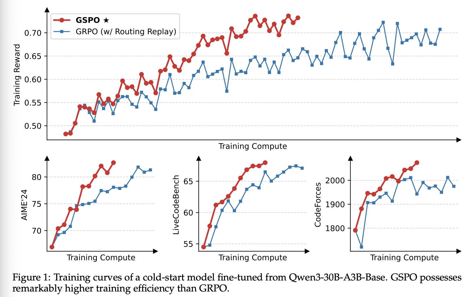 Benefit of GSPO。尽管路由重放能够使 GRPO 训练的 MoE 模型正常收敛,但其重用路由模式的做法会带来额外的内存和通信开销,并且可能限制 MoE 模型的实际容量。相比之下,如图 1 所示,GSPO 消除了对路由重放的依赖,能够以常规方式计算重要性比率 ,正常收敛并稳定优化。其关键在于 GSPO 仅关注序列似然(即 ),而不关注单个 token 似然(即 )。由于 MoE 模型始终保持其语言建模能力,因此序列似然不会出现剧烈波动。总之,GSPO 从根本上解决了 MoE 模型中专家激活波动的问题,避免了使用路由重放等复杂变通方法。这不仅简化和稳定了训练过程,而且还使模型能够在不受人为限制的情况下充分发挥其能力。